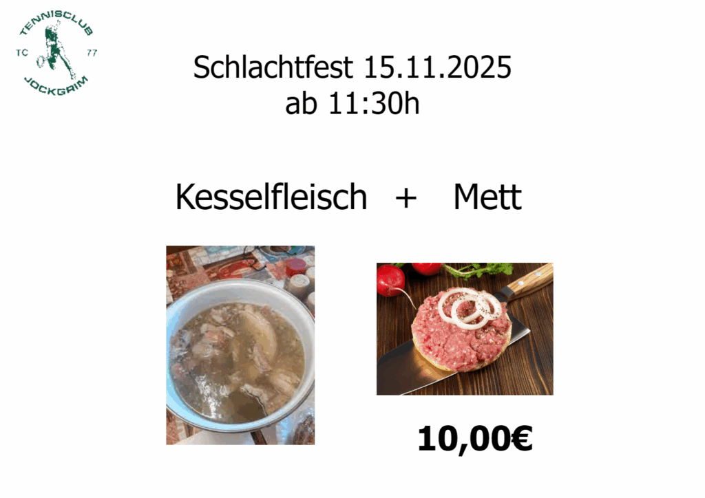 Das Schlachtfest des Tennisclub TC 77 e.V. Jockgrim fand am 15.11.2025 statt. Es ist ein jährlich wiederkehrendes, beliebtes Event, das die Mitglieder und Gäste des Vereins in der Regel im Herbst oder frühen Winter zusammenbringt, um traditionelle Pfälzer Spezialitäten zu genießen.